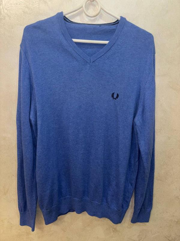 Синій пуловер fred perry з v-подібним вирізом та логотипом лаврового вінка, розмір l