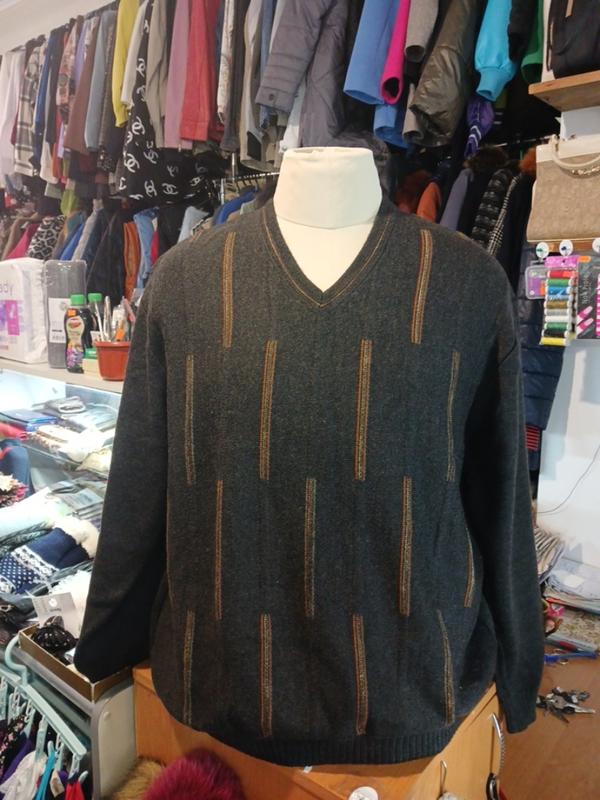 мужской свитер, трикотаж. темно-коричневого цвета с V-образным вырезом горловины. Основными особенностями являются вертикальные полосы. размер XXL. 50% шерсть 50% акрила длина 75 см плечи 60 см рукав 63 см по груди 68 см 20/24