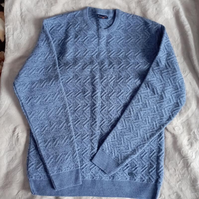 мужской свитер производства Турции полушерстяной очень теплый и праздничный подойдет как для праздничных событий под брюки так и под джинсы ткань рифленая узорчатая Плотная стан ближе нового одевался один раз в маловатый поэтому продаем пол объем груди 60 см длина 76 см рукав от горловины 86 см от линии плеча 69 см цвет серо-голубой