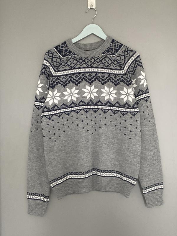 Чоловічий сірий різдвяний святковий светр з довгими рукавами зі сніжинками