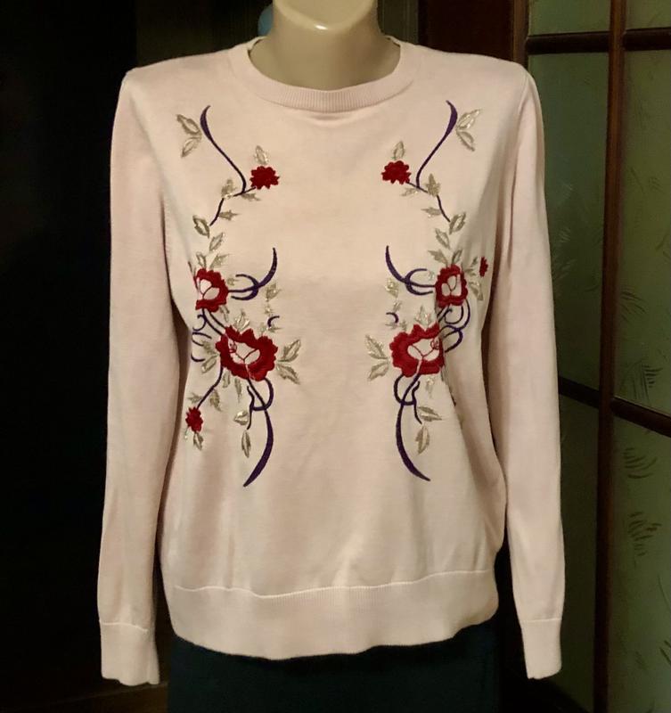 Свитер спереди с вышитыми цветами. На манжетах. Красиво и с юбкой и брюками носить. Длина- 56 см. Ширина (в груди)- 51 см. Рукав- 58 см. Отправляю Новой и Укр. Почтой