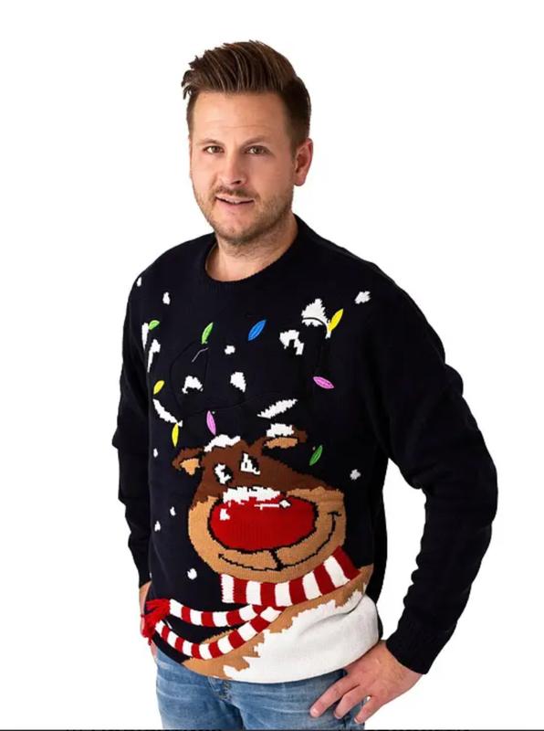 Чоловічий светр з Рудрльфом і з кольоровими лед вогниками,які мигають .Темно-синій Розмір М Довжина 68 Плечі 47 Рукав 73 НОГ 50 НОТ 49 НОС 48 Склад на фото Накладений 150 грн