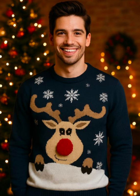 Свитер темно-синего цвета с новогодним рисунком. На передней части изображено оленя с крупными рогами, бежевого цвета мордочкой и объемным красным носом, который выступает из ткани. Вокруг оленя разбросаны белые снежинки, что добавляет зимнего настроения. Нижняя часть свитера выполнена в белом цвете, будто олень стоит в снегу. Свитер имеет круглый вырез и выглядит уютно и празднично. Хорошая модель, красивая, практичная, удобная. Порадует Вас и окружающих. Бренд производитель: george Размер по бирки: xl-подойдет на украинский 50-52, взглянет замеры. ВЫМЕРЫ: 🌳 ДОВЖИНА:75 СМ 🌳 ОТ ПЛЕЧА К ПЛЕЧА: 48 СМ 🌳 ДЛ.РУКАВА: 73 СМ 🌳 ГРУДИ ПОВНА ШИРИНА: 130СМ 🌳 ТАЛІЯ ПОВНА ШИРИНА: 130 СМ 🌳 ПО НІЗУ ПОВНА ШИРИНА: 112 СМ ( манжет)
