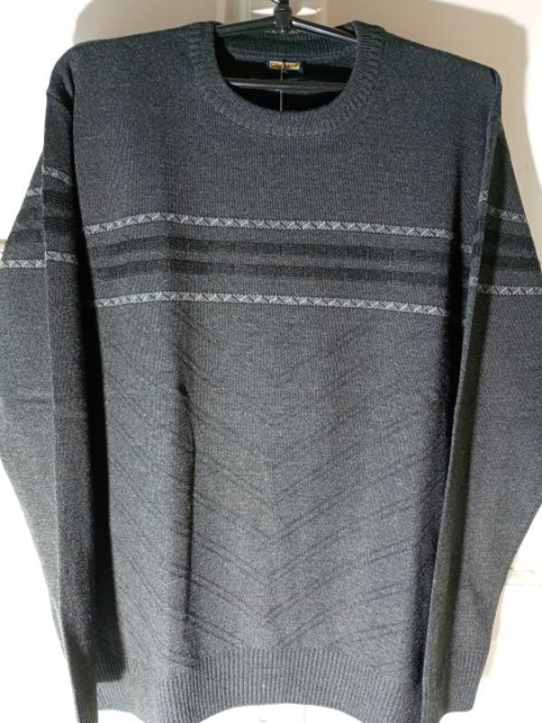 Свитер мужской цвет графит с орнаментом в виде горизонтальных полос серого и черного цветов, в также вязаный орнамент на передней планке. Батальной серии. Очень хорошего качества. Классический фасон. Полированная Шерсть 70% и акрил 30% размеры в см: 2XL ПОГ63 ДВ 73. ПР от горловины 84 3XL ПОГ 66 ДВ 77 ДР от горловины 90 4 XL ПОГ 68 ДВ 79 ДР от горловины 96