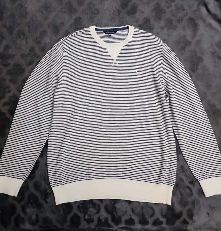 Стильний бавовняний светр в смужку відомого своєю якістю бренду CREW, розмір вказаний ххл, в носці не був, на останньому фото видно паперові наліпки, ціна нижче, бо не збереглася верхня паперова бірка. Плечі-52, пог-60, довжина-75, рукав-71 від плечового шва.