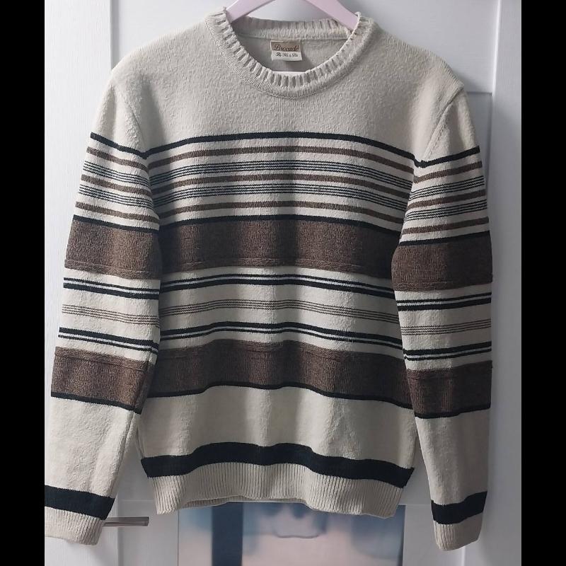 Свитер теплый, состав:50% шерсть, 50%-акрил, цвет бежевый, полоски черные и коричневые. Замеры: плечи 48 см, грудная -56 см, длина рукава 65 см, длина по спине -67 см.