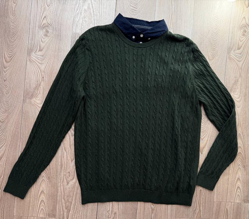 Светер чоловічий зелений LINCOLN🛍️❤️🔥 Розмір - UK 14-16/EUR 42-44/ USA 10-12/ XL / 50-52. Склад: 100% бавовна. Виробник Бангладеш. Светер з косами середньої щільності. Круглий виріз коміра та вшитий комір синього кольору. Вишивка-логотип на грудях. Додаткові заміри: повна довжина 74 см, ширина плечей 50 см, довжина рукава 71 см, напівобхват грудей 65 см (повний обхват 130 см) і тягнеться до 140 см, напівобхват талії 62 см (повний обхват 124 см) і тягнеться до 140 см, напівобхват резинки внизу 52 см (повний обхват 104 см) і тягнеться до 140 см.