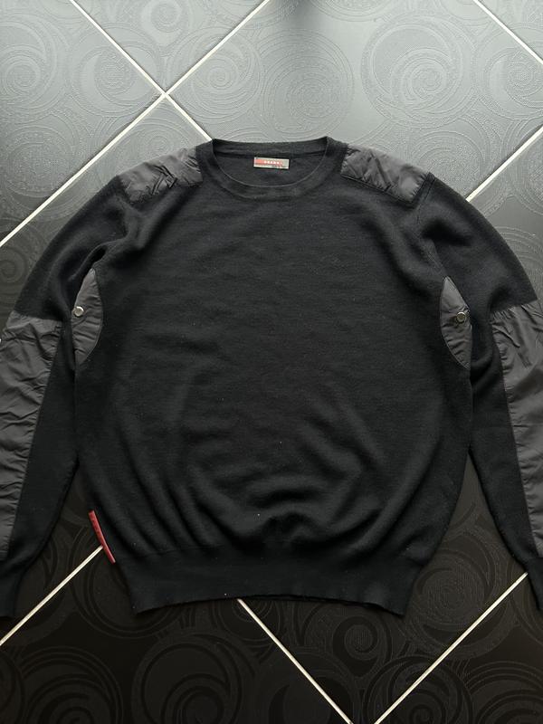 Преміальний шерстяний светр від італійського дому моди Prada. Особливості: • Матеріал: натуральна шерсть з нейлоновими вставками на рукавах • Колір: глибокий чорний • Розмір: L-XL • Стан: ідеальний 10/10 • Класичний крій з круглим вирізом • Контрастні нейлонові панелі додають сучасності • Червона фірмова етикетка Prada Примітка: потребує пришивання верхньої бірки. Ідеальний вибір для створення елегантного повсякденного або ділового образу. Поєднання благородної шерсті та технічного нейлону відображає інноваційний підхід Prada до класичного одягу.