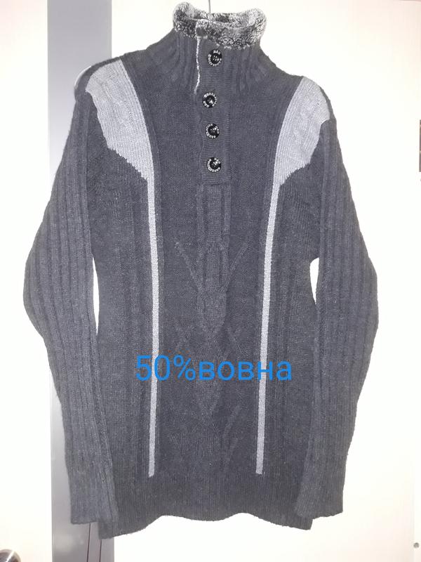 Очень теплый свитер из 50% шерсти и 50% акрила.Замеры:от подмышки до подмышки 52 см, ПОТ 50 см,низ 48 см.Длина 78 см.Длина рукавов 66 см от шва,82 см от горловины.Экохетро на горловину, застегивается на 4 пуговицу.