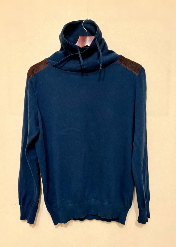 Свитер мужской Xside с высоким воротником, который регулируется завязками Со вставками из искусственной замши на плечах и на локтях Ширина плечей 45 см НОГ 50 см Длина изделия 65 см Длина рукава 63 см Ширина по резинке снизу 40 см Высота воротника 20 см