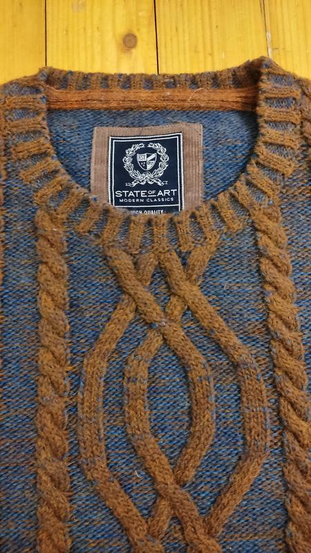 Это мужской свитер от бренда одежды State of Art Modern Classics. размер L. Замеры Полу обхват груди _61см. Плечі_50см. Длина от воротника _70см. Длина рукава _66см. Ширина по нижньому краю (резинка)_50см. Описание свитера: Бренд: State of Art – нидерландский бренд мужской одежды премиум-класса, известный своим классическим дизайном с современными акцентами. Линейка "Modern Classics" сочетает качество и вневременной стиль. Материал и дизайн: Свитер имеет текстурированный узор из больших переплетенных кос (аранов). Выполнен из меланжевой пряжи, которая визуально сочетает синие и коричневые/оранжевые оттенки. Цвет: Преобладают оттенки синего и коричневого/теракотового цветов - супер цвет. Детали: На внутренней стороне горловины расположена коричневая вельветовая вставка с нашивкой бренда.