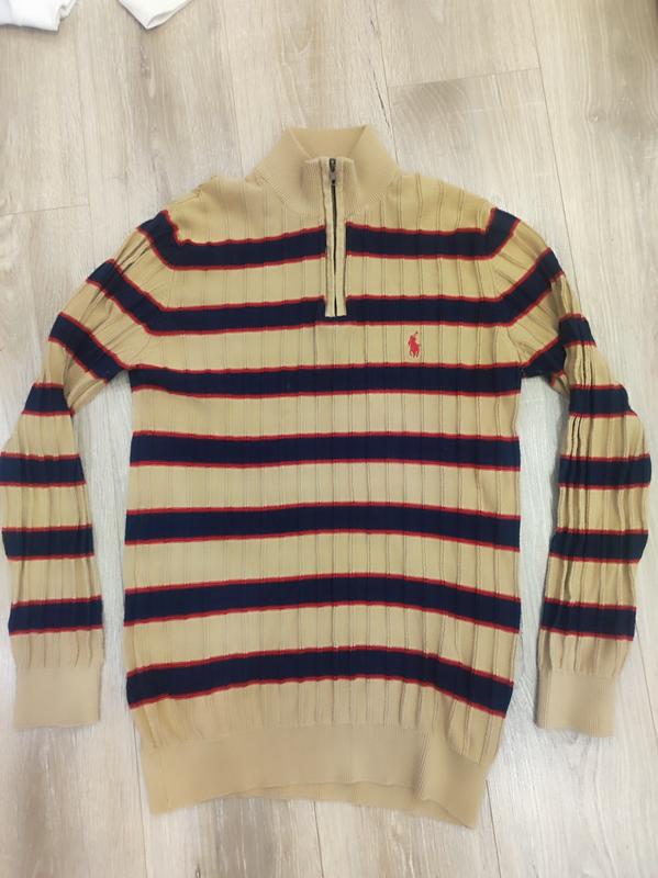 Свитер Polo Ralph Lauren в полоску с молнией на 1/4, бежевого цвета с темно-синими и красными полосами. Без дефектов. Требует стирки. Если вам не совсем подходит эта вещь по размеру или цвету - переходите на мой профиль, там могут быть похожие вещи в других размерах и цветах. Работаю по частичной или полной переплате.