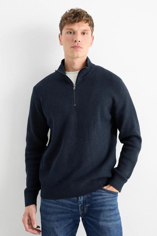Темно-синий мужской свитер с высоким воротником на застежке зип, отвод бренда C&A.Склад:58% полиэстер, 22% акрил, 19% хлопок, 1% эластан