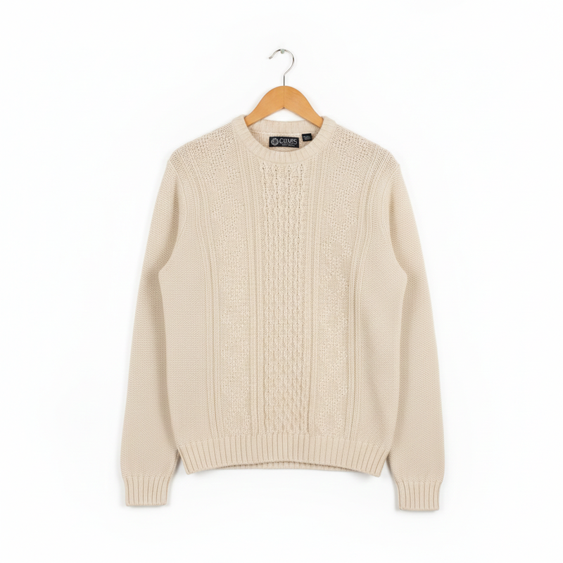 Вязка: Традиционный узор с вертикальными фактурными линиями по центру. Детали: Аккуратная горловина, манжеты и низ изделия выполнены «резинкой». Цвет: классический песочный или светло-бежевый.Свитер в идеальном состоянии длина 71 плечи 47 рукав 68 пог 57