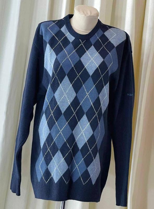Светр вовняний чоловічий синього кольору з ромбами PALMER🛍️❤️🔥 Розмір - UK 10-12/ EUR 38-40/ M / 46-48. Склад : 80% вовна, 20% нейлон. Виробник Китай. Светр з вовни середньої товщини, спереду з ромбами в блакитних відтінках. Круглий виріз горловини з неширокою резинкою. На одному рукаві логотип-вишивка бренду. Додаткові заміри: повна довжина 75 см, ширина плечей 51-53 см, довжина рукава 66 см, напівобхват грудей 52 см (повний обхват 104 см) і тягнеться до 120 см, напівобхват талії 48 см (повний обхват 96 см) і тягнеться до 110 см, напівобхват стегна 49 см (повний обхват 98 см) і тягнеться до 126 см.