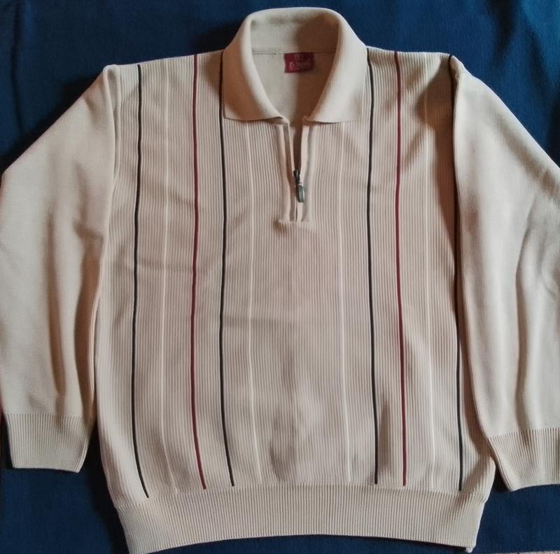 Свитер мужской с воротником, на молнии. Цвет: бежевый. Замеры: длина сзади от воротника 64 см плечи 54 см,рукав 55 см, полуобхват по низу в нерастянутом состоянии 46 см, промежутк подмышками 57 см.