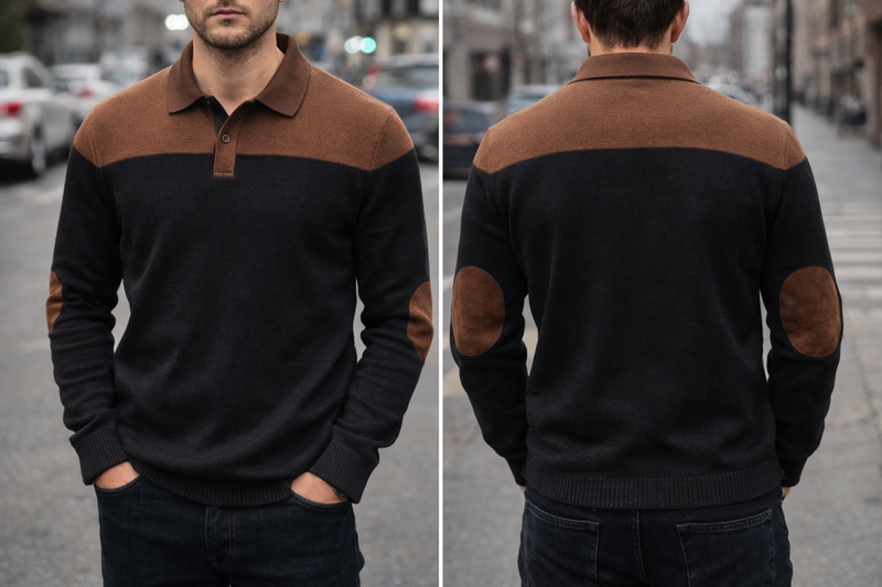Свитер 1 – черный с коричневыми вставками Новое изделие. Стильный черный свитер с коричневым воротником и вставками от груди до плеч. На локтях – круглые коричневые акценты. Современный городской стиль. Фото спереди и сзади. Свитер 2 – белый с коричневым воротником Новое изделие. Белый свитер с контрастным коричневым воротником в стиле поло. Лаконичный дизайн, универсален для повседневного и нарядного образа. Фото спереди и сзади.