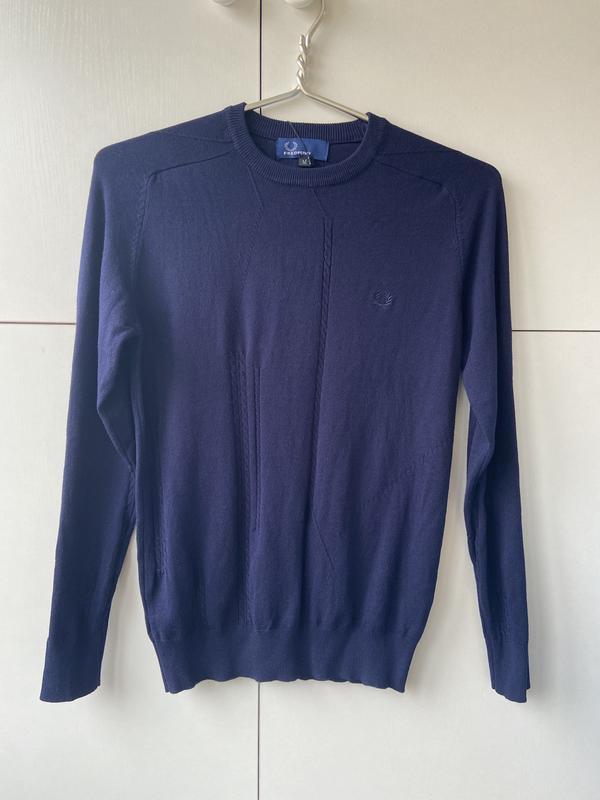 Тонкий светр фірми "Fred Perry", колір темно-синій, розмір М, об'єм грудей - 88 див.,довжина виробу від шиї - 66 див., рукав від шиї - 72см., склад: котон - 95%, спандекс - 5%, приємний для тіла.