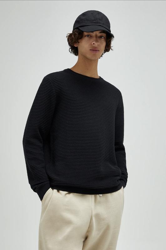 Свитер с вафельной текстурой, круглым воротником, длинными рукавами и окантовкой в рубчик. Изготовлен из 100% -го хлопка.