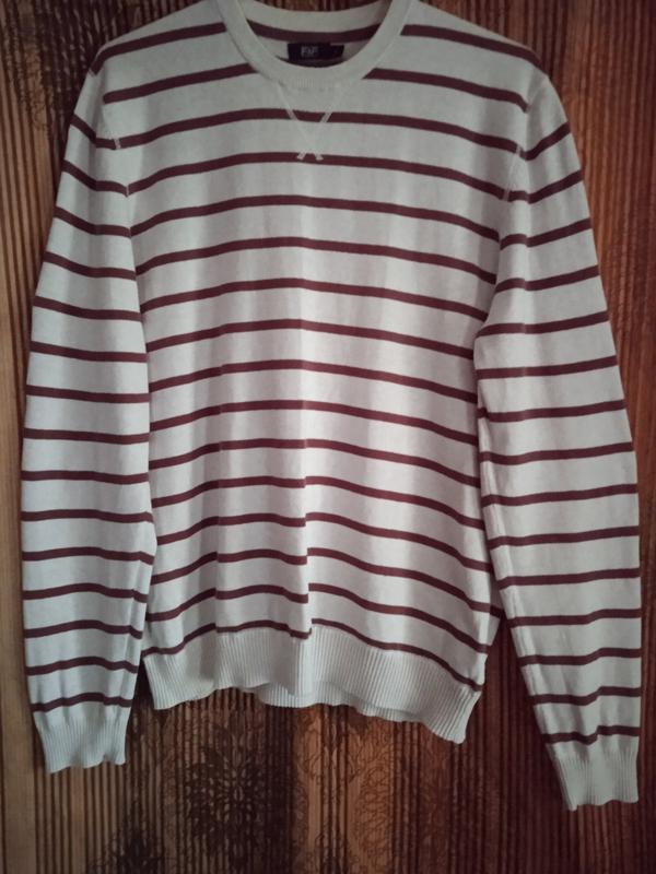 Мужской свитер от F&F, полоска сливочно-бордовая, мягкий тонкий хлопковый трикотаж. Размер: UK L. Состав: 100% коттон. Замеры: длина рукава 74 см, Пог 58 см, Длина спинки 71 см.