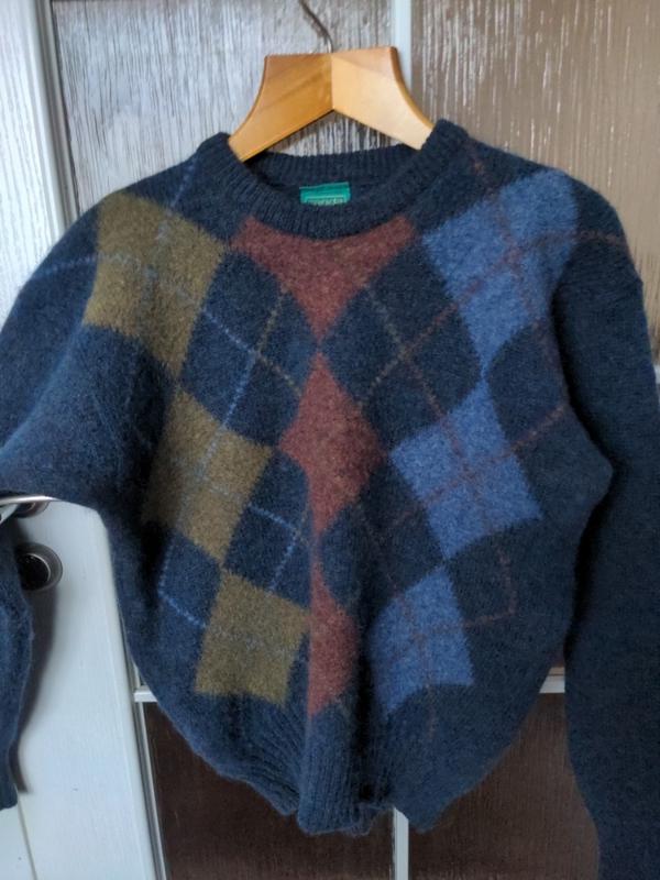 нарядный свитер, синего с серым цвета, спереди в разноцветный ромб, сзади однотонный. состоит на 70 процентов из шерсти, остальное полиэстер. на холодное время года. он средней плотности, довольно теплый. размер указан M. замеры см. плечи 50, подмышки 54, длина по спинке 60, рукав от плеча 56.