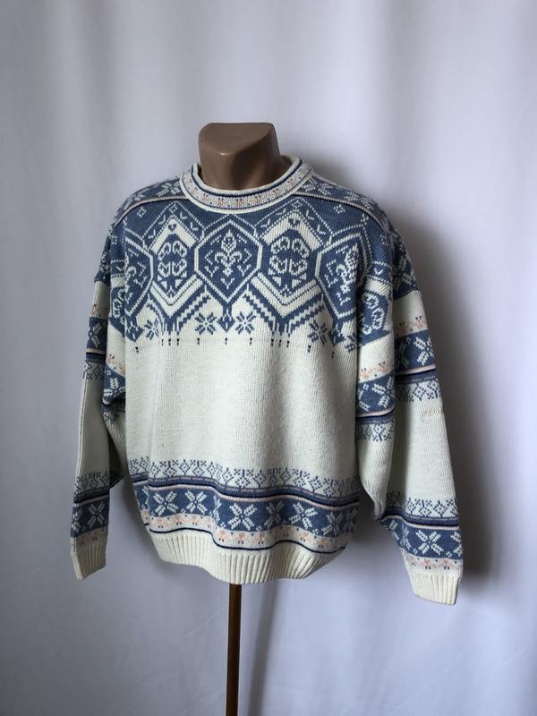 Винтаж орнамент свитер голубой с белым шерсть бленд норвежский скандинавский ретро винтажн...