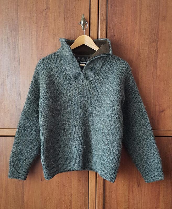 Зелений чоловічий вовняний светр Barbour. 100% вовна. Зменшився після невдалого прання. Розмір M. Ширина в зоні плечей - 49 см, ширина в зоні грудей - 52 см, довжина рукава - 59 см, довжина - 64 см.