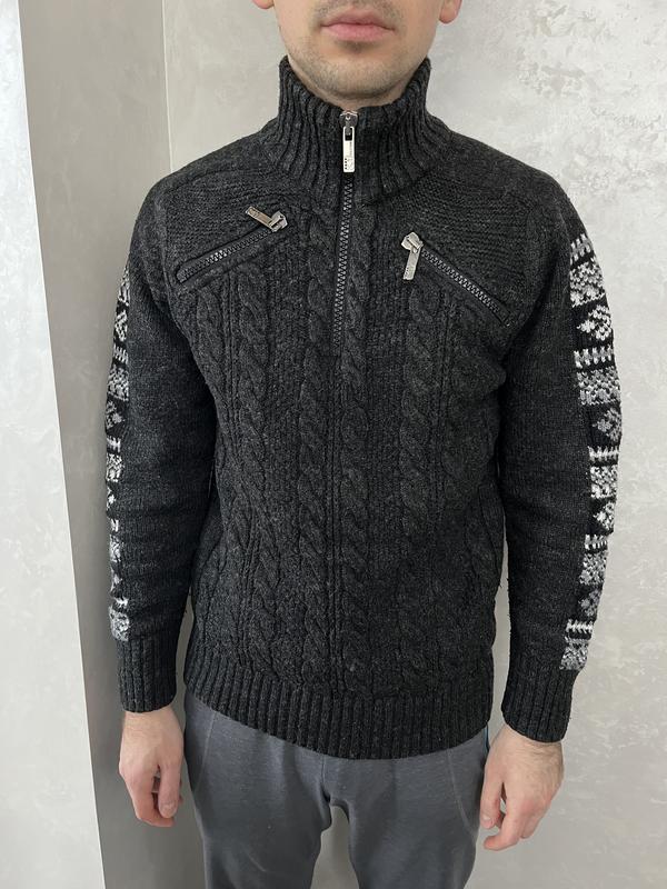 Мужской свитер красивого темного-серого цвета (ближе цвет к реальному на 2 фото). Хороший состав (70 % шерсти), свитер не колется. Параметры изделия: - Длина по спинке (без стойки) 66 см, - Высота горловины 9 см - Ширина 49 см - Ширина резинки внизу 38 см - Длина рукава (от горловины) 74 см На фото рост 186 см