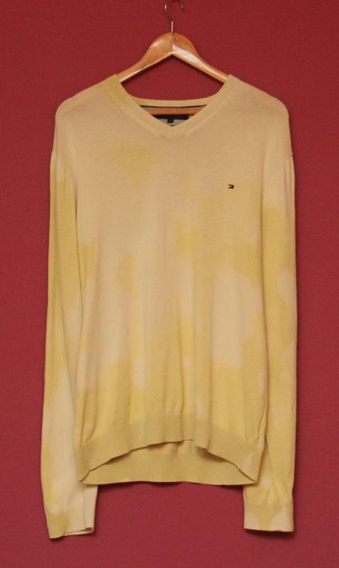 Окрашенный вручную после скройки, но до нанесения синтетических элементов свитер от Tommy Hilfiger, оригинал в хорошем состоянии. Сукно из отборного длинноволоконного хлопка. V-образный вырез, фирменное лого-таблеточка на груди. Плечи - 53 Подмышки - 59 Длинна - 72 Рукав по-верху и по-низу - 73, 56