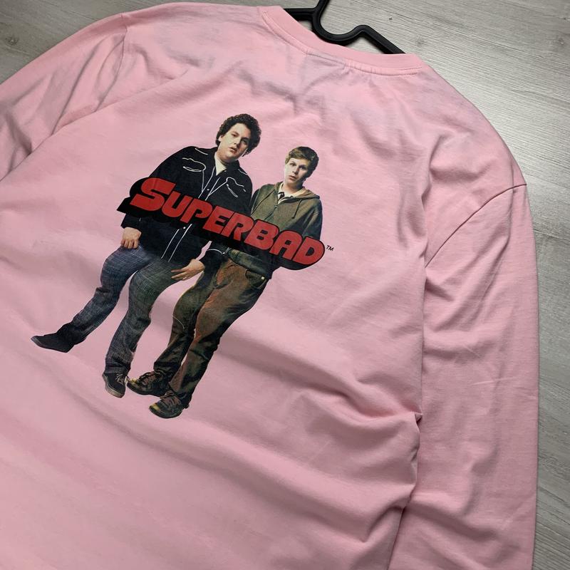 Плотный свитшот в розовом оттенке. На спине и спереди принт в тематике фильма «Супер перца». По телу будет идти свободно. Рукава на манжетах - параметри: • плечи 50 • п/о груди 61 • длина 73 • рукав 67