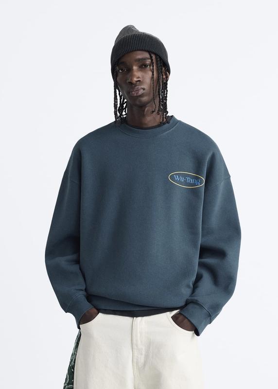 Світшот з довгим рукавом і круглим вирізом. Контрастний Wu-Tang Clan © 2023 Wu-Tang Clan друкується спереду та ззаду. Ребристі оздоблення. Синій Розмір XL