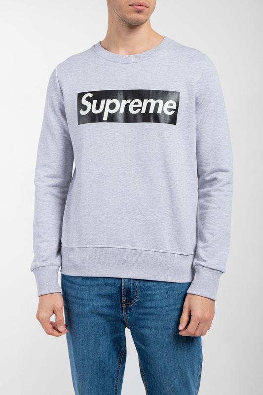 Чоловічий сірий світшот із бавовни від Supreme Spain (Суприм Спейн). Подовжена модель, круглий виріз горловини, довгі рукави, трикотажна резинка на манжетах та по низу виробу, принт з логотипом бренду на грудях Розмір: S Артикул: SFU02