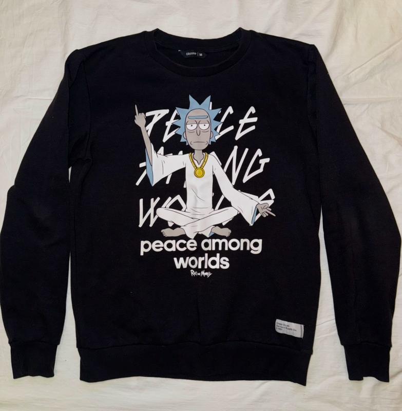 черный свитшот cropp с надписью peace among worlds rick and morty 300 грн размер М 58% полиэстер, 42% хлопок длина: 69 см ширина: 53 см длина рукава: 66 см