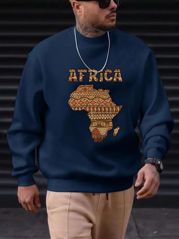 Толстовка мужская с круглым вырезом, черная, 100% полиэстер с небольшой растяжкой, свободный крой, трикотажная ткань, 250 г/м2, принт с африканской картой, свитшот с длинным рукавом для спорта и поездок на работу,размер L
