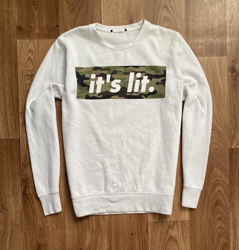 Розмір S (плечі 40, пів обхват груди 51, довжина 62, рукав від шиї 73) Чудовий білий світшот. Великий принт спереду. Нічого зайвого. Гарно виглядає
