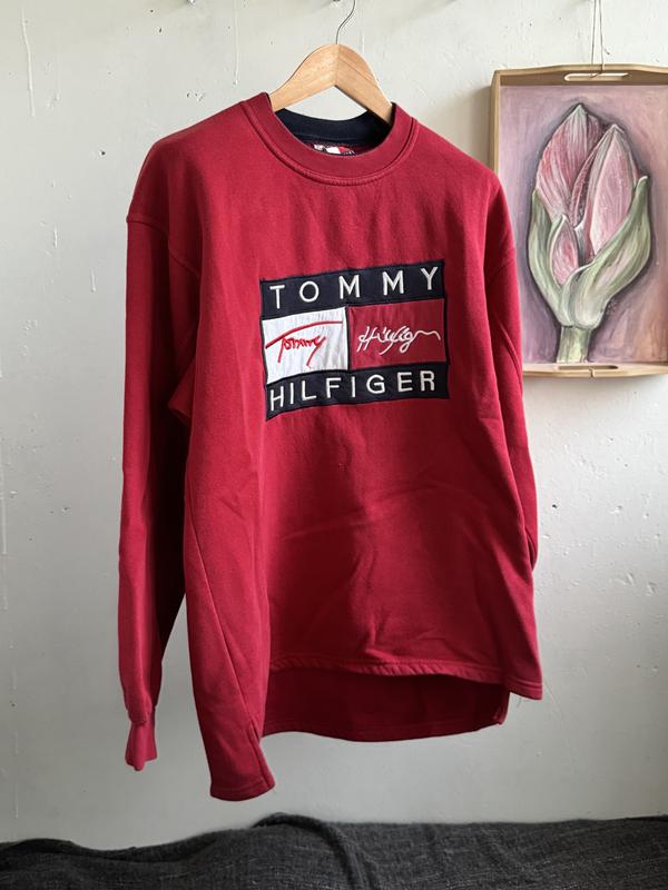 Красный свитшот от Tommy Hilfiger. Стильный и комфортный, идет оверсайз со спущенным плечом. Размер XL Плечи 60 Длина рукава 59 Груди 63 Длина от ворота 77