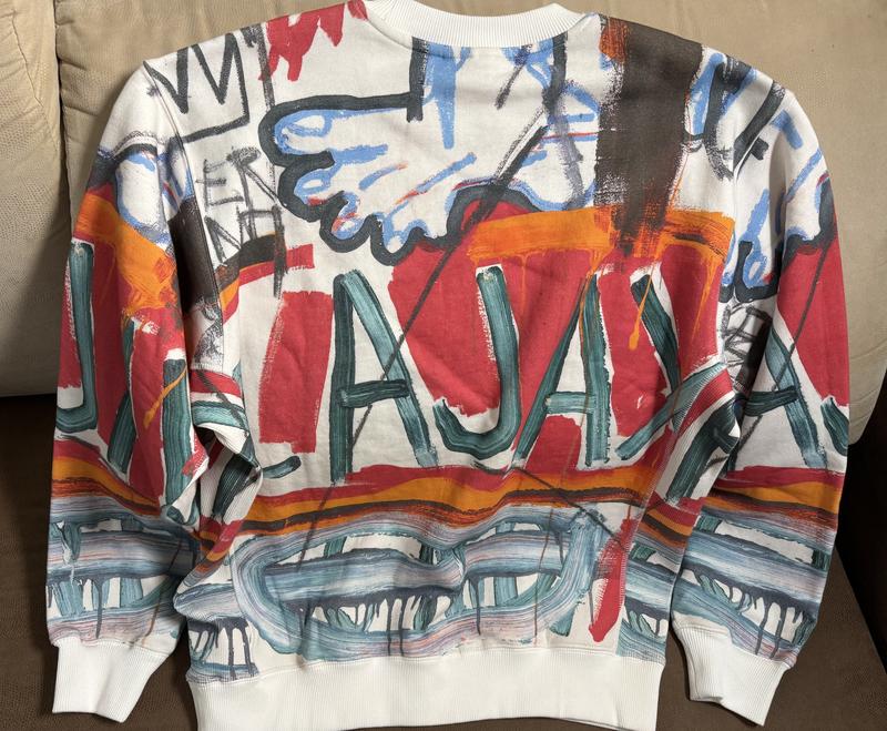 H&M x Basquiat x Ev&Tela Basquiat x Ev Bravado & Téla D'Amore x H&M. В колаборації дизайнерської колекціі культового мистецтва Баскии імайстерністю дизайнерів Ev Bravado и Téla D'Amore. Це вільний світшот оверсайз зі 100% бавовни і мʼяким всередині… Вільний крій із круглим вирізом в рубчик и довгими рукавами. Ребриста панель по бокам и широка резинка на манжетах і в низу.. Склад: 100% - бавовна ., в розмірі S: Груди- 63см., талія 49см.,Плечі– 52см., по спині -67см., Рукава - 63см