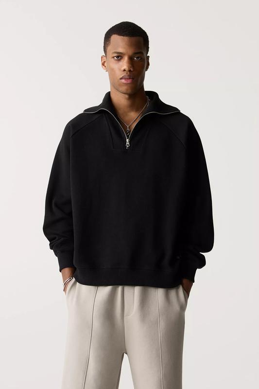 Світшот із довгими рукавами та блискавкою на грудях. Колекція P&B Black Label. Розмір L, більшомірить на XL Довжина по спині 68 см Ширина в грудях 68 см Ширина по низу 53 см (резинка тягнеться) Довжина рукава від коміра 80 см 75% бавовна, 25% поліестер Чорний колір