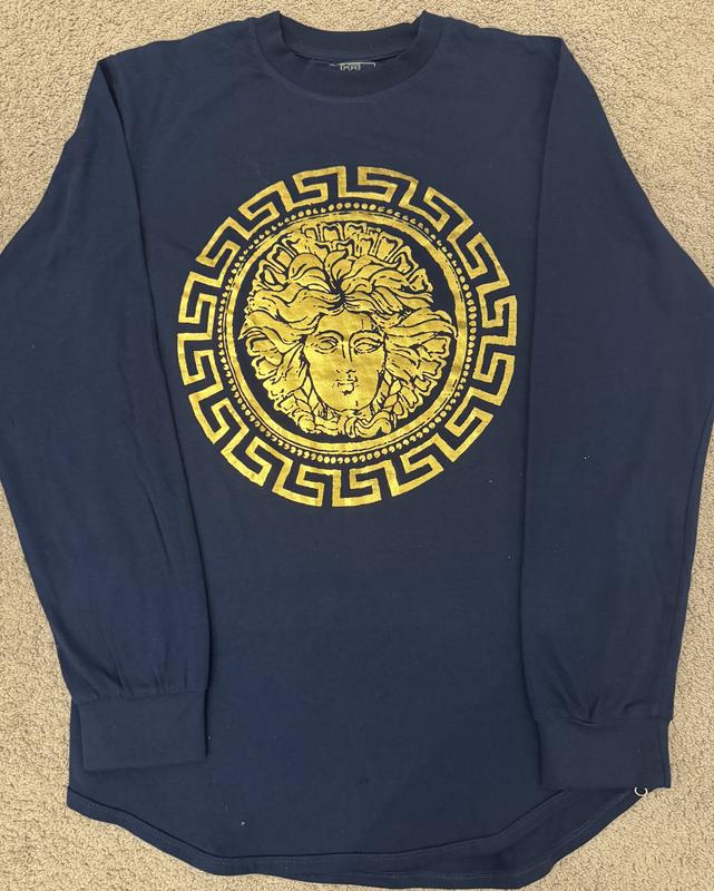 Синій чоловічий світшот з золотим логотипом та синя чоловіча трикотажна кофта розміру L. Модель виготовлена із тонкого еластичного трикотажу. - Модель з принтом. - Круглий виріз. - Крій slim. - Довжина рукава від плеча 67 см - Довжина: 79 см - Ширина 50 см - Параметри вказані для розміру: L Кофта привезена зі Штатів