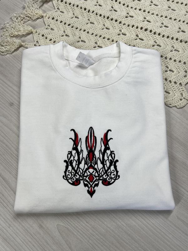 Свитшот на легком флисе унисекс Дизайнерская вышивка Трезуб Собственное производство Ткань - 80% хлопок, 20% полистер, плотность 280 г/м2 На фото кофта белого цвета, по желанию можем вышить в другом цвете Цена - 850 грн.