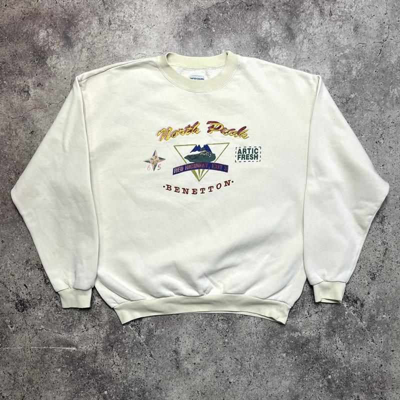 Світшот United Colors of Benetton made in Italy Длина 63 Полуобхват 63 Плечи 61 Рукав 58 Размер XL(на М-L) Оригинальный vintage свитшот Benetton “North Peak”, сделанный в Италии. Молочный цвет, плотный коттон с мягким начесом внутри – теплый, комфортный и очень атмосферный.