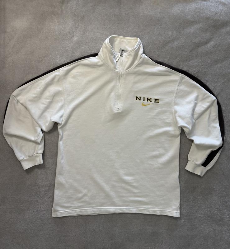 Чоловічий вінтажний світшот Nike на блискавці до грудей та високим коміром Колір: білий, з коричневими полосами на рукавах Розмір: по бірці М але може зійти й на L Довжина спереду - 72 см Ширина в грудях - 54 см Довжина рукава від плечей - 58 см Ширина в плечах - 52 см Стан: ідеальний без дифектів Якщо цікавить звертайтесь!