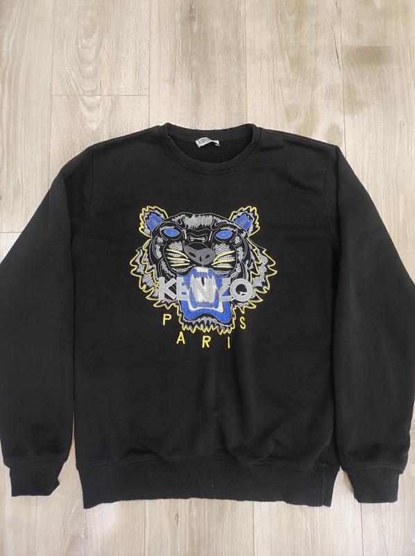 Свитшот Kenzo с фирменной вышивкой в виде тигра. Из мягкого хлопка с длинными рукавами и резинкой по низу и манжетами. Цвет насыщенный черный. Единственный недостаток - немного затертые манжеты и резинка внизу. По бірці XL, по факту M Если вам не совсем подходит эта вещь по размеру или цвету - переходите на мой профиль, там могут быть похожие вещи в других размерах и цветах. Работаю по частичной или полной переплате.
