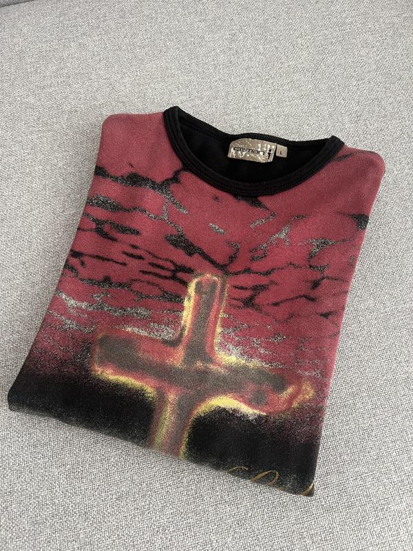 Чоловічий вінтажний лонгслів, футболка з довгим рукавом з мʼякої теплої тканини з виістом котону. Чорні рукава та спина, по переду графічний малюнок хреста. Розмір вказаний L, є заміри на фото. Гарний стан