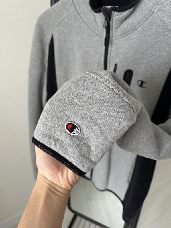 Стильна олімпійка Champion у сіро-чорному дизайні. Щільний трикотаж, комір-стійка та три кишені на блискавці. Преміальна якість та ідеальна посадка для вашого комфортного повсякденного образу.