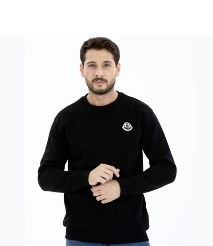 Чоловічий світшот чорного кольору бренду Moncler з нашивкою бренду на груді. Напів обхват під рукавами 52 см, довжина 69 см, довжина рукава 59 см.