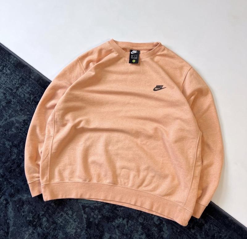 Це чоловічий світшот Nike Sportswear Crew Revival у персиковому або абрикосовому кольорі (офіційна назва кольору часто вказується як Apricot Agate). Класичний крій (crew neck) з еластичними манжетами та подолом у рубчик. На грудях розміщено невеликий логотип Nike Futura, часто виконаний з матеріалу Nike Grind (вторинно перероблена гума/взуття). Розмір XXL