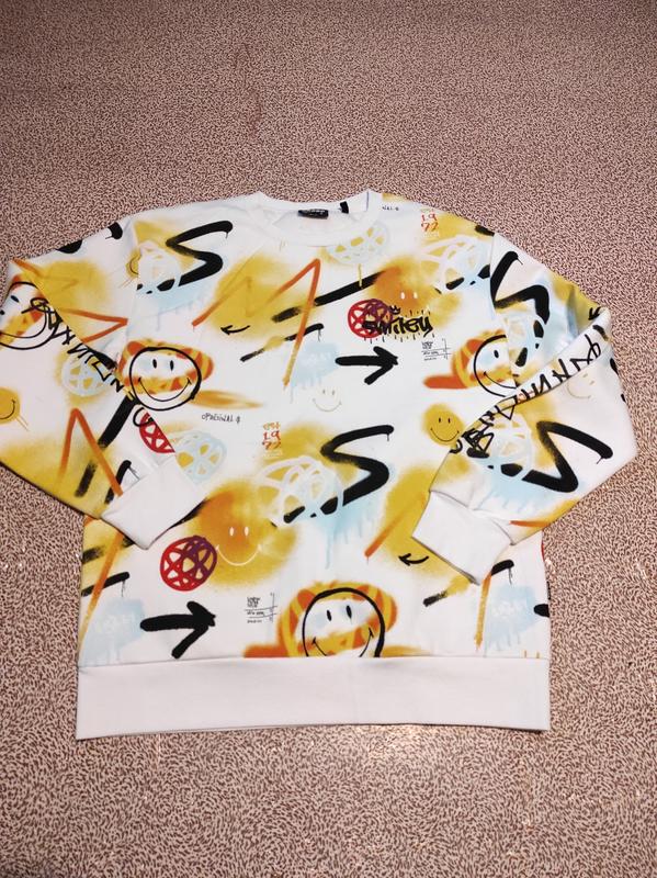Світшот білий, жовтий, чорний, бавовна і поліестер, всередині з начосом. Плечі 55 див. ПОГ 59 див. Довжина 75 см. Рукав 65 див. ПО низу рукава 9 див. ПО низу свитшота 50 див.