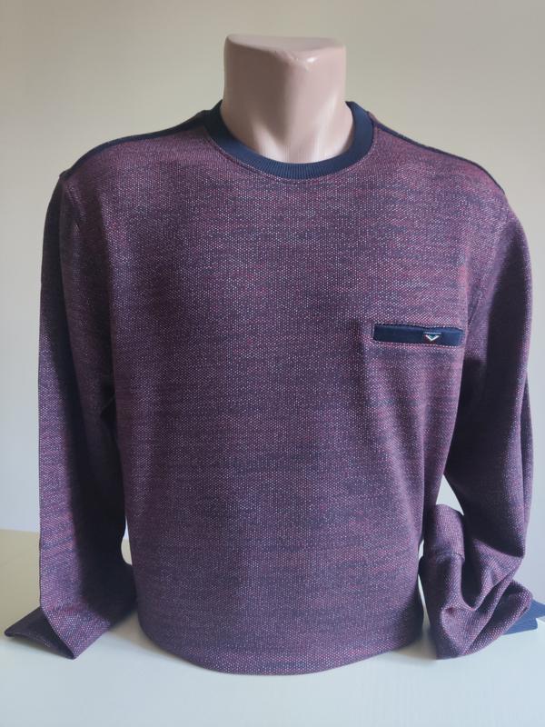 Нова модель турецького елітного бренду.Світшот з бавовняної тканини середньої щільності, c низом і манжетами рукавів на гумці. Малюнок складається з дрібних червоних і синіх фішок на бордовому тлі. На грудях - потайна кишеня з застібкою на внутрішній кнопці з вишитою невеликою емблемою. На рукаві ниткою вишита емблема бренду. Обробка кишені виготовлена з гладкої плащової тканини. Обробка кишені,виріз горловини, манжети рукавів і гумка низу - темно-синього кольору. Склад тканини: 70% бавовни, 20% віскози, 10% акрилу. ПОГ довжина рукав M 54 69 63 L 56 71 64 XL 58 73 65
