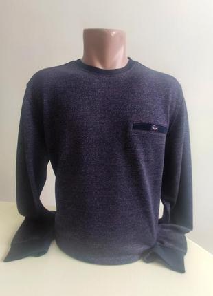 Нова модель турецького елітного бренду.Світшот з бавовняної тканини середньої щільності, c низом і манжетами рукавів на гумці. Малюнок складається з дрібних світло і темно бузкових фішок на темно-синьому тлі.Колір виробу темно бузковий. На грудях - потайна кишеня з застібкою на внутрішній кнопці з вишитою невеликою емблемою. На рукаві ниткою вишита емблема бренду. Обробка кишені виготовлена з гладкої плащової тканини. Обробка кишені,виріз горловини, манжети рукавів і гумка низу - темно-синього кольору. Склад тканини: 70% бавовни, 20% віскози, 10% акрилу. ПОГ довжина рукав M 54 69 63 L 56 71 64 XL 58 73 65